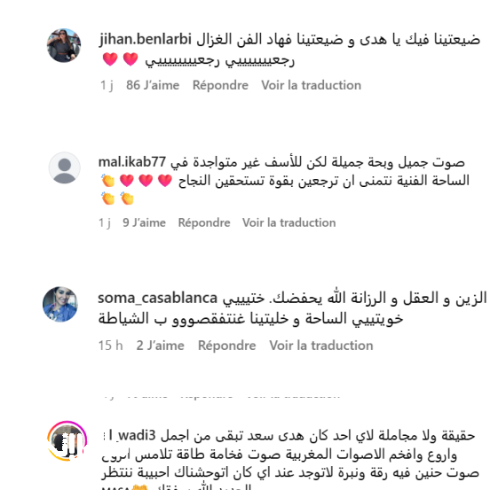 من الجدير بالذكر أن آخر أعمال الفنانة هدى سعد كانت أغنية “مغربنا”، التي أصدرتها بمناسبة الاحتفال بعيد الاستقلال في العام الماضي. ورغم مرور فترة على آخر إصدار لها، فإن ظهورها الأخير أثبت أن جمهورها ما زال ينتظر المزيد من إبداعاتها ويشعر بالارتباط العاطفي بموسيقاها وأسلوبها الفريد.