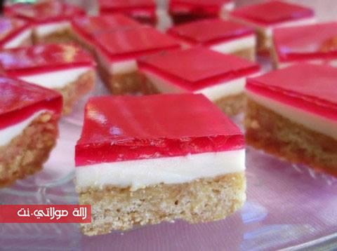 نخفق البيض لدرجه الرغوة ونضيف له السكر ونخفقه الى ان يذوب تمام ونضيف لهم برش الليمون ونخفق نرفعه من الخفاق الكهربائي ونضيف بالتدريج الطحين ونخلطع بملعقه ونضيف له البيكنغ باودر ونخلطه الى ان يتجانس الخليط نختار وعاء شوي مربع الشكل وندهنه ونسكب الخليط وندخله الفرن على درجه حراره 200 لمده نصف ساعه تمام ونخرجه ونتركه يبرد تمام ونرفعه عن الوعاء نأخذ الوعاء ونغسله ونعمل الجلي فيه ونتركه يجمد من بعدها نجلب الكيكه ونغلفها بالكريم شانتي وبمهاره ناخذ وعاء الجلي ونضعه بماء حار ثواني ونرفعه ونسكبه ببطئ حتى يغطي الكيكه تماما وندخلها الثلاجه حتى تبرد ويفضل باليوم الثاني تقطعيها