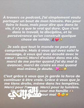 ليلى أوضحت في رسالتها أن ظهورها في البودكاست لم يكن هدفه إثارة البلبلة أو البحث عن شهرة زائفة، بل كان نابعا من رغبة عميقة في مشاركة جزء من مسارها الشخصي مع جمهورها، محاولة بذلك تسليط الضوء على محطات حقيقية من حياتها. كما عبرت من خلال كلماتها عن قناعة راسخة بأن الصدق يظل القيمة الأسمى التي لا يطالها الزوال مهما اشتدت العواصف.