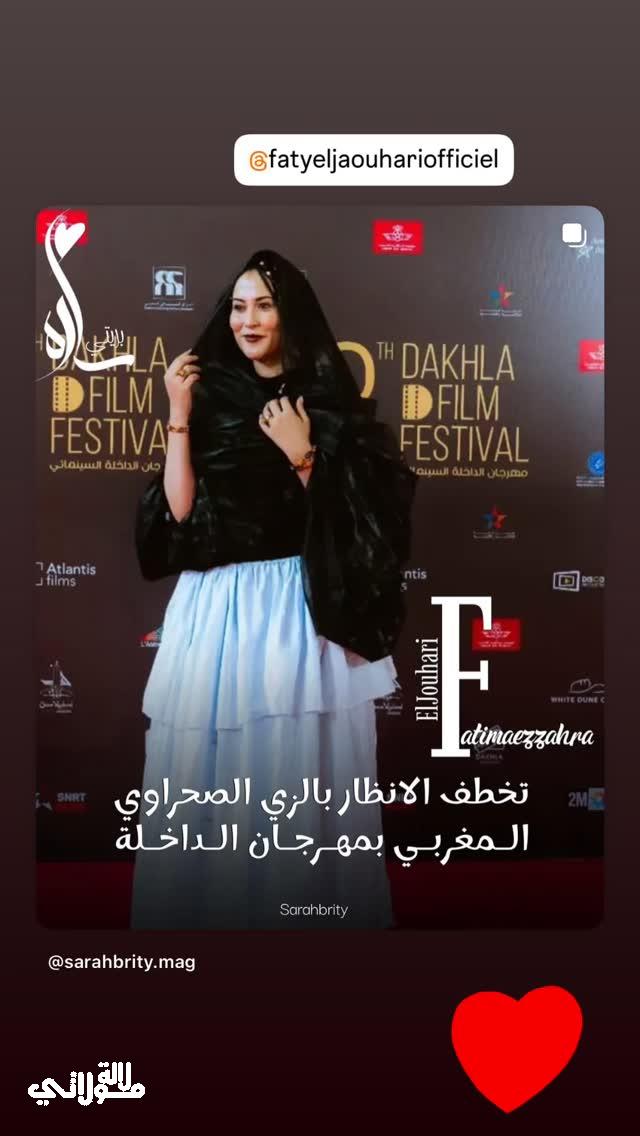 سطعت الفنانة المغربية فاطمة الزهراء الجوهري بإطلالة آسرة خطفت الأنظار خلال مشاركتها ضمن فعاليات النسخة الثالثة عشرة من المهرجان الدولي للفيلم الذي احتضنته مدينة الداخلة، حيث لفت حضورها المتابعين بإحساس جمالي عكس ثقتها وأناقتها. فقد ارتدت الجوهري زيا صحراويا تقليديا أبرز أصالة الزي المغربي وارتباطها القوي بجذورها الثقافية، الأمر الذي أثار إعجاب جمهورها على منصات التواصل الاجتماعي، إذ عبر كثيرون عن إعجابهم بتفاصيل طلتها الراقية واختيارها الذكي الذي جمع بين البساطة والرقي.