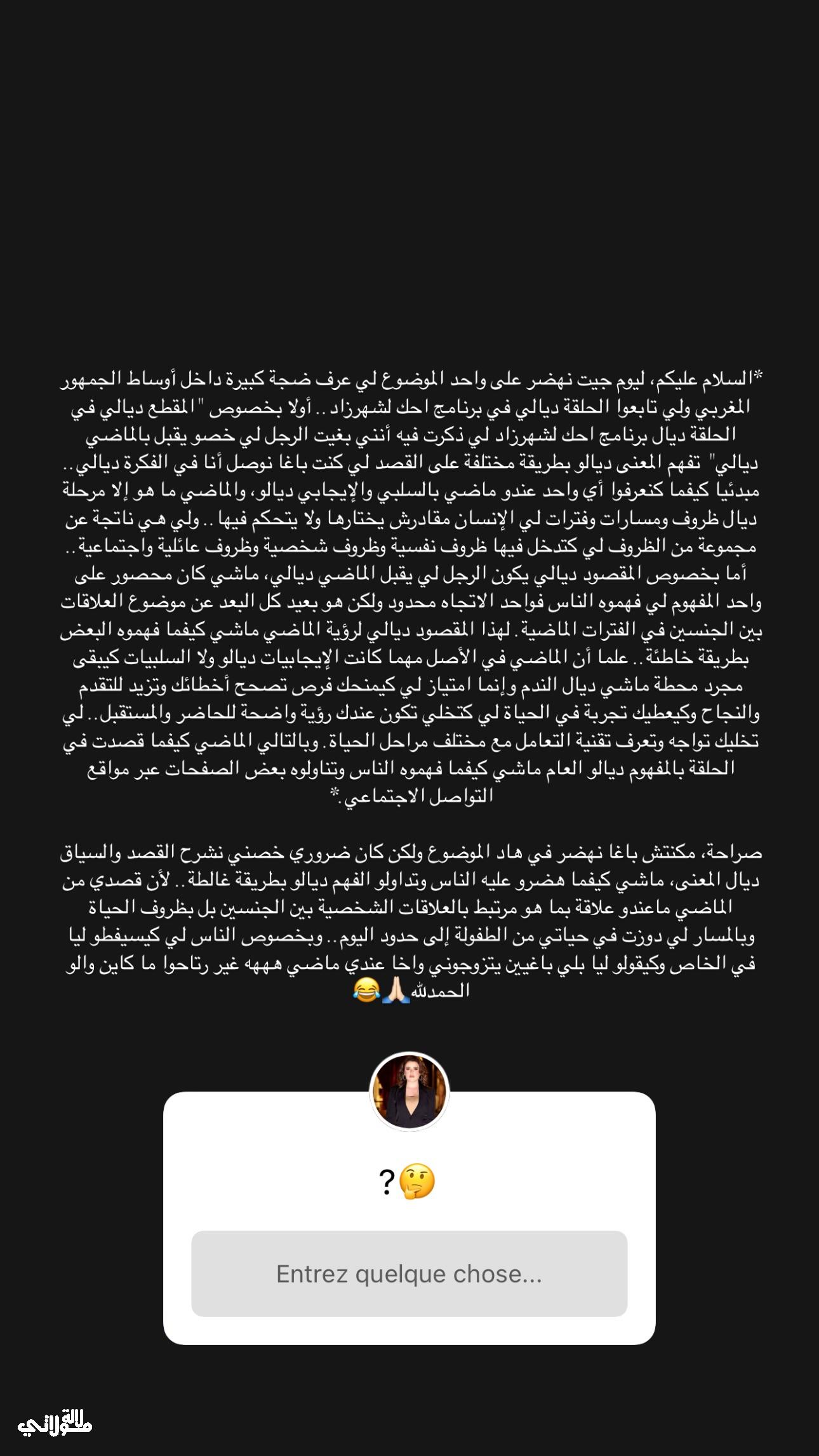 خرجت الفنانة المغربية يسرى بوحموش عن صمتها لتوضح الملابسات التي أحاطت بتصريحها المثير للجدل أثناء استضافتها في برنامج “احك لشهرزاد”، حيث انتشر مقطع مصور تحدثت فيه عن رغبتها في رجل يتقبل ماضيها، الأمر الذي أثار موجة من الانتقادات والتأويلات المتباينة بين الجمهور المغربي.