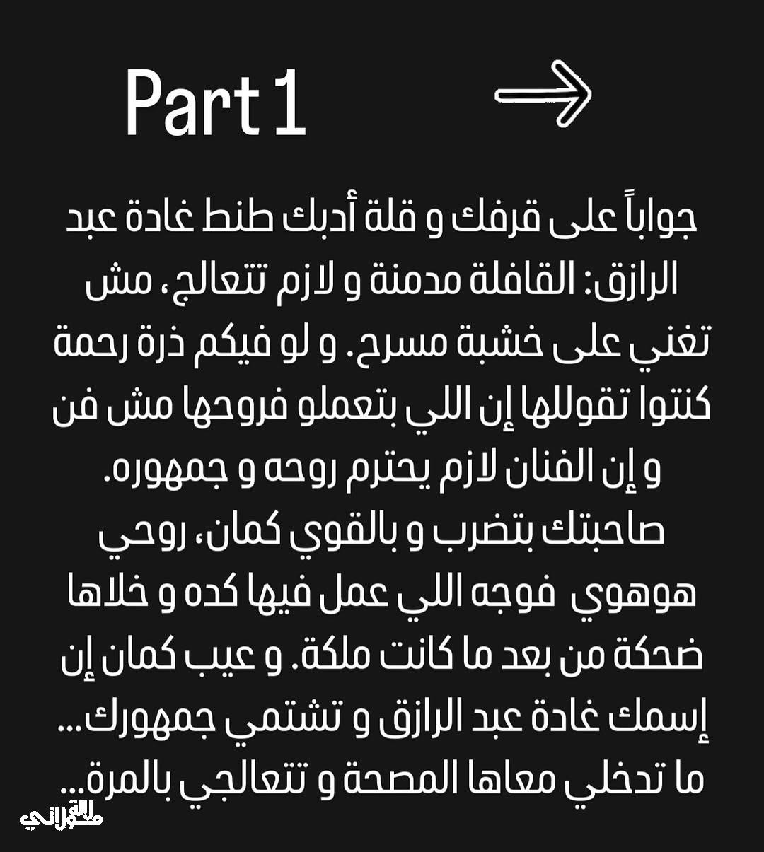 وكتب رشيد الإدريسي قائلا:””جوابا على قرفك وقلة ادبك طنط غادة عبد الرازق: القافلة مدمنة ولازم تتعالج مش تغني على خشبة مسرح، ولو فيكم ذرة رحمة كنتوا تقوللها إن اللي بتعملوه فروحها مش فن، وإن الفنان لازم يحترم روحه وجمهوره. وصاحبتك بتضرب بالقوي كمان، روحي هوهوي فوجه اللي عمل فيها كده وخلاها ضحكة من بعد ما كانت ملكة. وعيب كمان إن اسمك غادة عبد الرازق وتشتمي جمهورك، ما تدخلي معاها المصحة وتتعالجي بالمرة.”