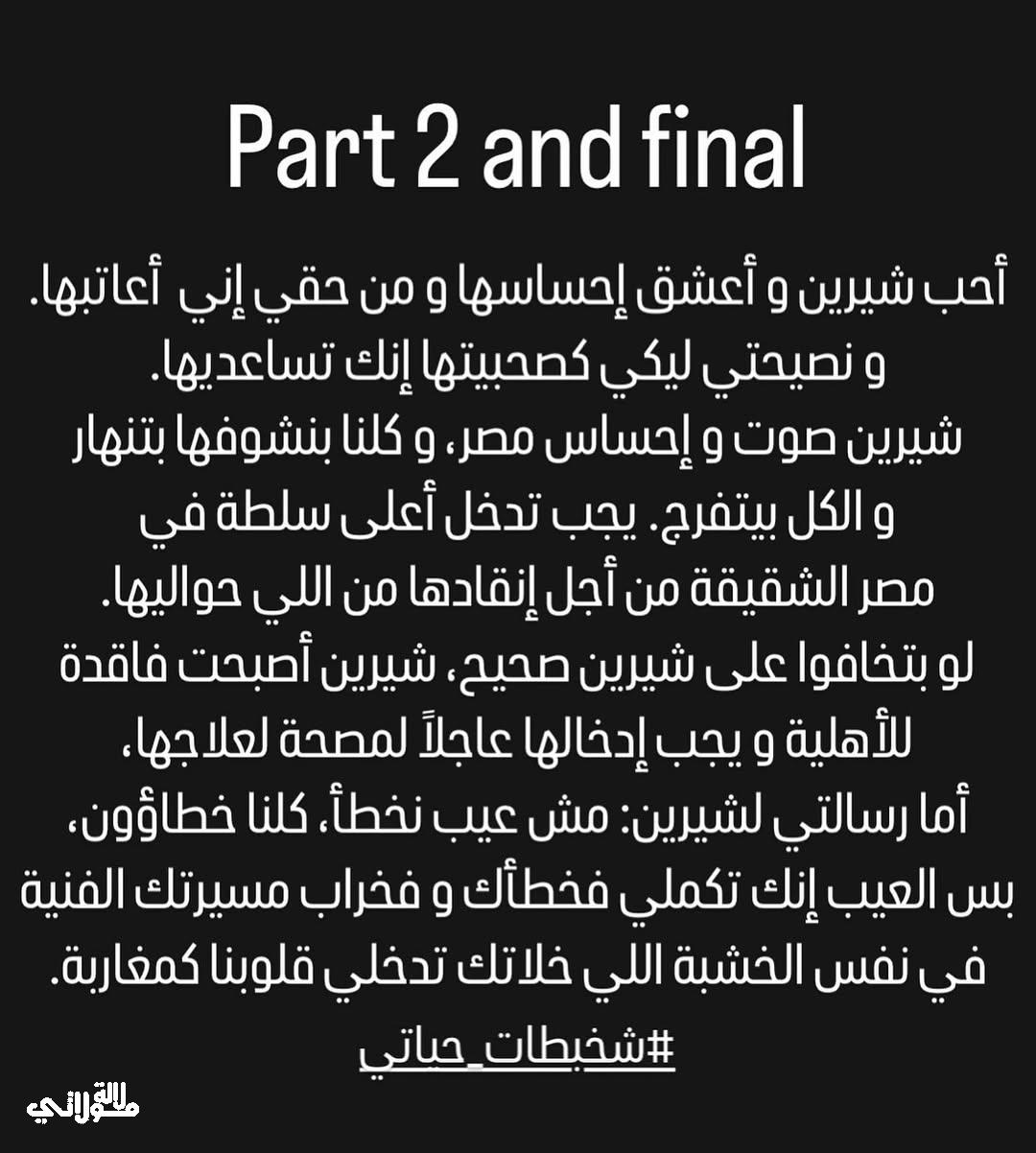وختم قائلا:”أما رسالتي لشيرين: مش عيب نخطأ، كلنا خطاؤون، بس العيب إنك تكملي في خطأك وفخراب مسيرتك الفنية في نفس الخشبة اللي خلاتك تدخلي قلوبنا كمغاربة.”