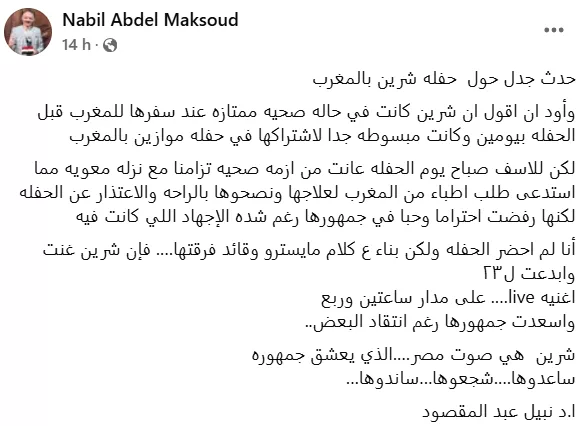 أصدر الدكتور نبيل عبد المقصود، المتخصص في علاج الإدمان والسموم، والذي يتابع الحالة الصحية للفنانة المصرية شيرين عبد الوهاب، تصريحا مفصلا حول الأزمة الصحية التي واجهتها شيرين أثناء مشاركتها في مهرجان “موازين – إيقاعات العالم” المقام في المغرب.