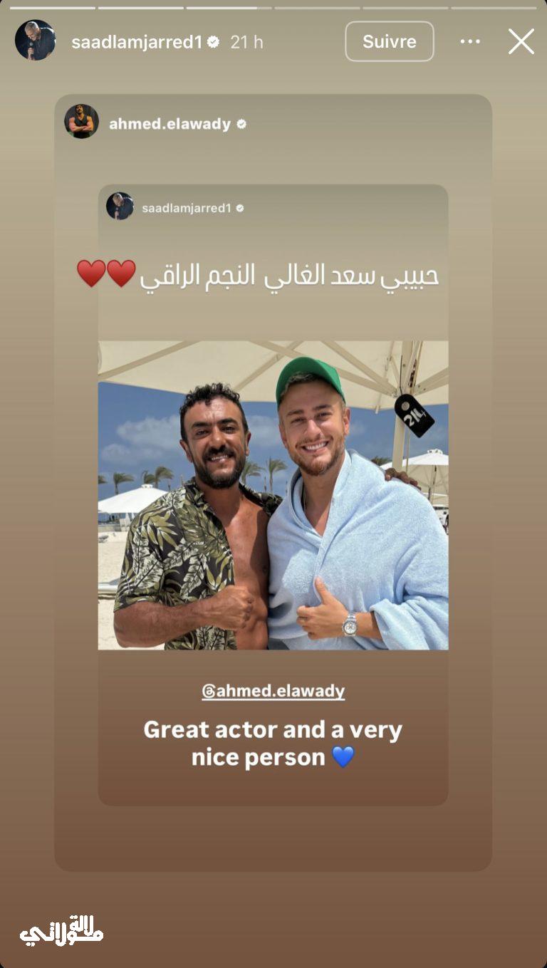 ولم يتأخر أحمد العوضي عن الرد على مبادرة لمجرد، إذ بادر بدوره إلى إعادة نشر الصورة على “ستوري” حسابه الرسمي، موجها رسالة شكر وتقدير للفنان المغربي، معبرا عن اعتزازه بصداقته وواصفا إياه بالنجم المميز وصاحب الحضور الراقي. هذا التبادل العفوي كشف عن عمق العلاقة الودية التي تجمعهما رغم اختلاف مجالات عملهما.