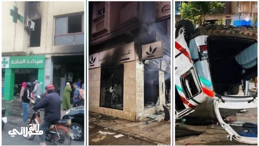 وفي التفاصيل، سجلت مدينة إنزكان آيت ملول تخريب ثلاث وكالات بنكية، وكالة للتأمين، صيدلية وعدة محلات تجارية، إضافة إلى تضرر ثلاث سيارات للقوات العمومية وأربع سيارات خاصة، بينما شهدت وجدة أنجاد أضرارا شملت أربعين سيارة ومتجرين.