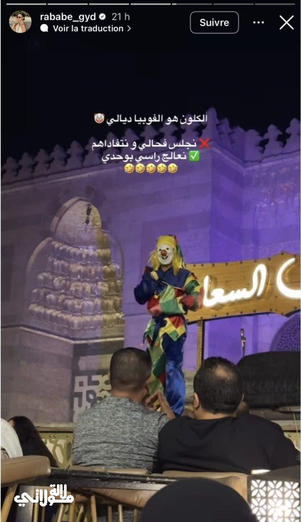 وكشفت رباب عن فوبياها عبر مقطع قصير على حسابها في “إنستغرام” ضمن خاصية “الستوري”، حيث ظهر بهلوان يؤدي حركات بهلوانية أمام الجمهور في مهرجان محلي، وكتبت تعليقا صريحا: “الكلون هو الفوبيا ديالي”، ما أثار تفاعل متابعيها الذين أعربوا عن دعمهم وتفهمهم لمخاوفها، رغم أن هذا النوع من الشخصيات عادة ما يبعث على الضحك والبهجة للآخرين.