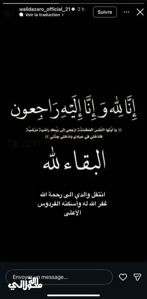أعلن اللاعب المغربي وليد أزارو، المعروف بمستوياته المتميزة مع المنتخب الوطني ونادي الأهلي المصري سابقا، عن وفاة والده عبر تدوينة مؤثرة على حسابه الرسمي في “إنستغرام”.