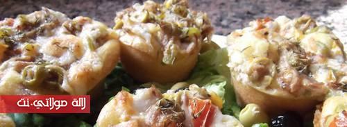 مطيشة وحدة منقية ومزولين ليها الزريعة ومقطعة مربعات حك طون مصفى من الزيت شوية الموزريلا مقطعة قطع صغيرة ابزار الزعيترة