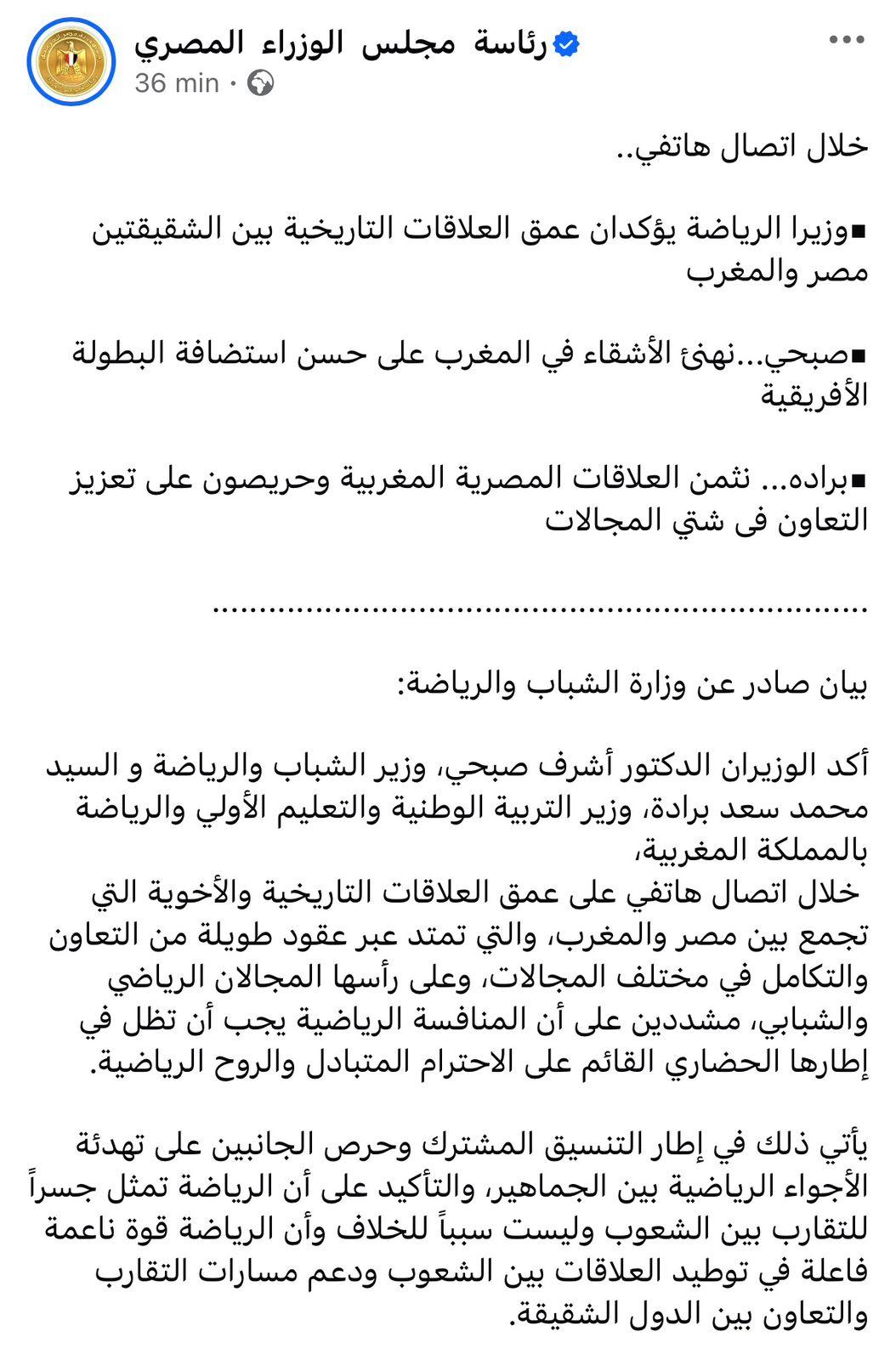 وأكد الوزيران في حديثهما على قوة الروابط التاريخية والأخوية بين البلدين، مشددين على أن المنافسة الرياضية يجب أن تبقى ضمن إطارها الحضاري، المبني على الاحترام المتبادل والروح الرياضية، ورفض أي سلوكيات تعصب أو إساءة قد تؤثر سلبا على العلاقات المتميزة بين مصر والمغرب أو تشوه صورة الجماهير العربية.