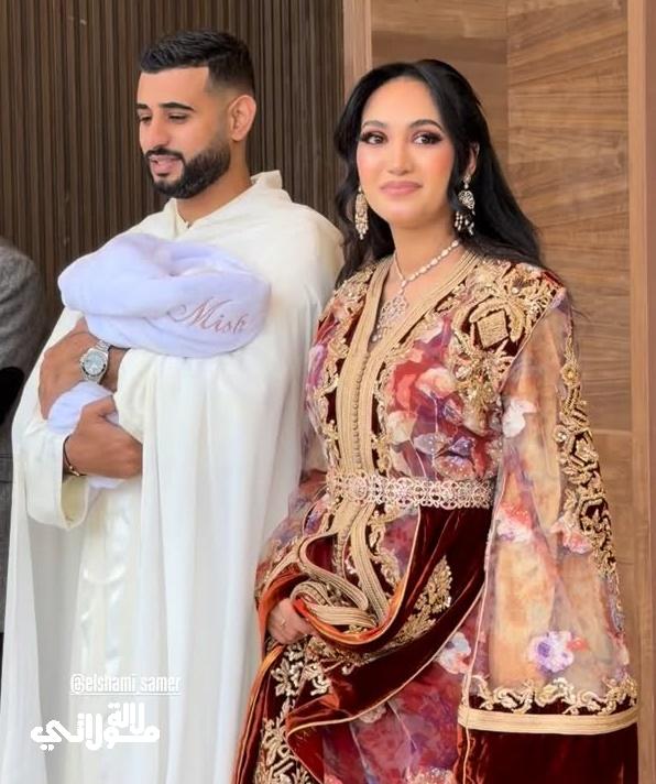 وفي الوقت نفسه، ظهر زوجها مرتدياً اللباس المغربي التقليدي مع السلهام، محافظاً على الطابع الرسمي والمهيب للاحتفال، بينما حمل بين يديه ابنتهما مسك برقة وعاطفة واضحة، ما أضفى على المناسبة لمسة من الدفء الأسري والفرح البسيط والمباشر.
