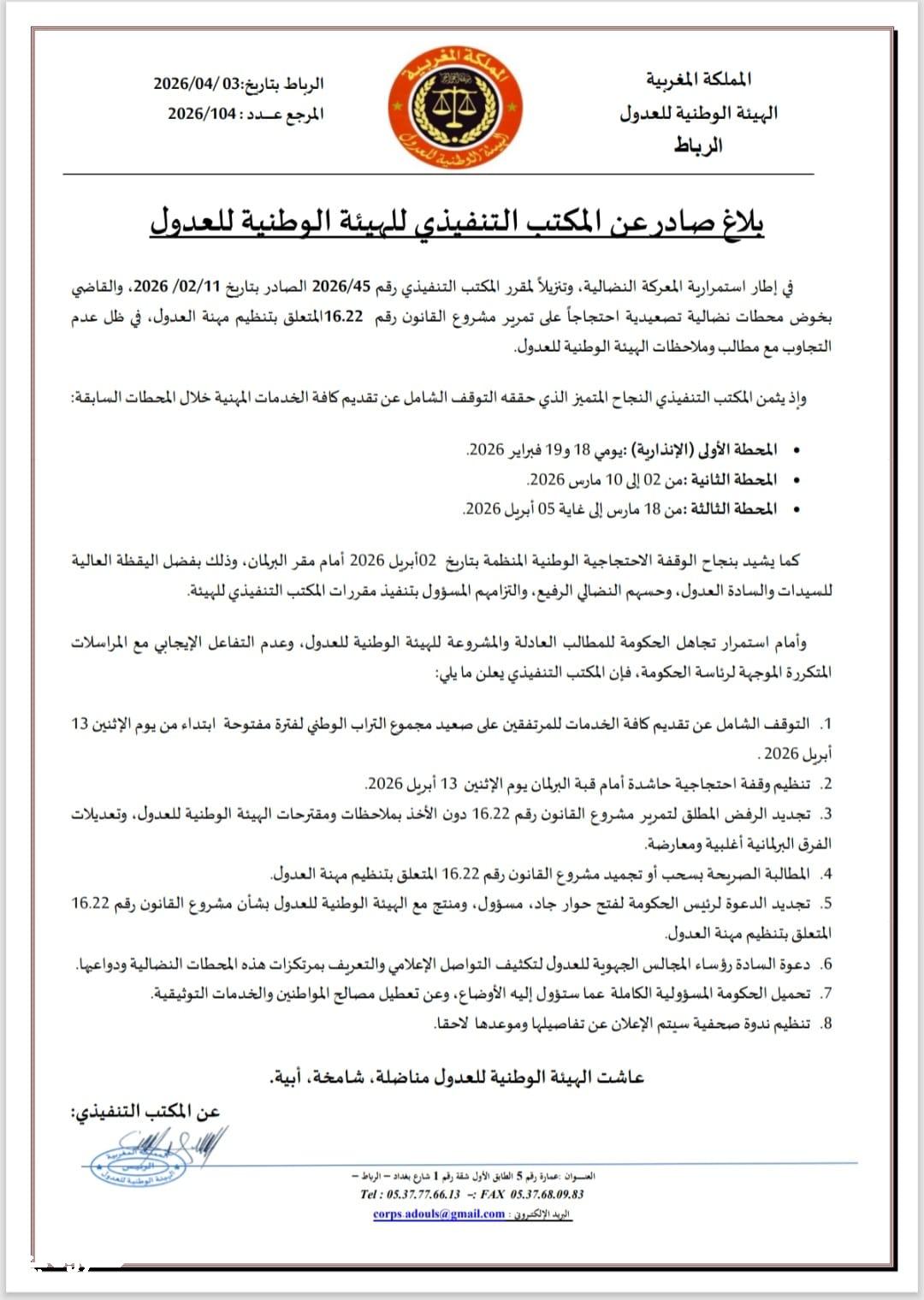 وفي ختام موقفها، حملت الهيئة الحكومة مسؤولية ما قد يترتب عن هذا الإضراب من تعطيل لمصالح المواطنين، محذرة من دخول المهنة في مرحلة من الشلل الإداري والقضائي، وداعية إلى التدخل العاجل لتدارك الوضع وفتح آفاق حل يوازن بين تحديث القطاع والحفاظ على استقراره.