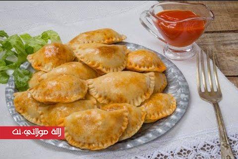 يمدد العجين المورق حتى يصبح بسمك 3 مم. يقطع العجين إلى 4 دوائر بقطر 15 سم.