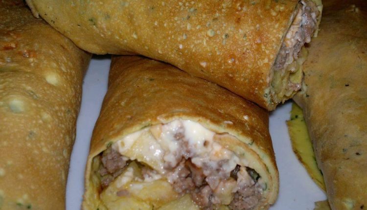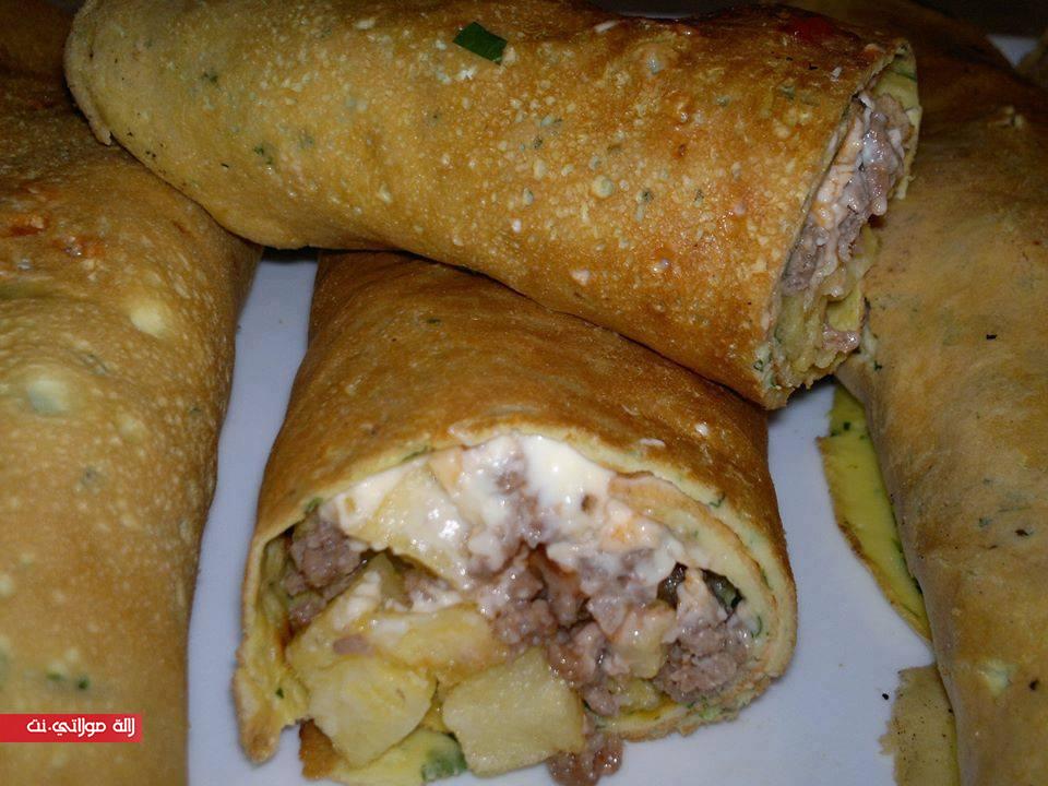نخلط المكونات في الخلاط و نبدأ في طهي الاومليط في مقلاة ساخنة ومدهونة بالقليل من الزبدة و في جهة اخرى نقوم بتقطيع البطاطس و و نقليها و نقوم بتشحير كفتة اللحم مع الفلفل و الملح و المعدنوس و القليل من الزيت نخلطها مع البطاطس و نزيد عليهم 2 بيضات و نضع وسط الأومليط القليل من البطاطس و الجبن مثلث و القليل من الكيتشب نقوم بلف الاومليط و تقطيعه حسب الرغبة و اللحم يمكن تعويضع بالتونة او الدجاج.