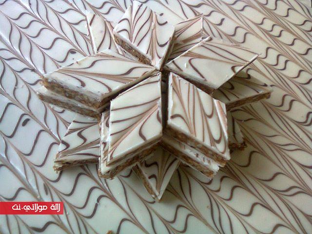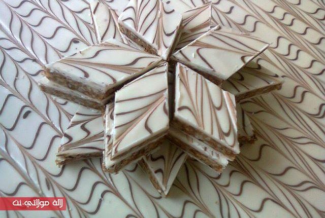 نضع الخليط في طاوة بلاستيكية، ثم طبقة من الشكلاط الاسود ونتركها حتى تتجمد ثم نضع عجينة الكاوكاو وطبقة ثالثة من الشكلاط الابيض
