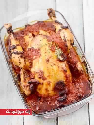 يغطى الدجاج بالألومنيوم، ويطهى مدة 45 دقيقة.