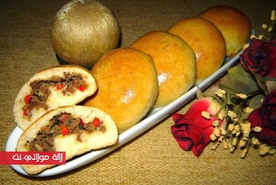 عملي طحين فقصعة عملي حفرة ديري فيها خيرة ملحة زبدة مدوبيهاش بيض سسكر حليب ددافي خدميها وخليها تخمر ثم عملي كويرات دهنيهم خليهم يخمرو تاني شوي لفلفلة ونقيها ثم قطعيها مربعات صغار .حكي لبيض.شحري لبصلة ولكفتة فشوي زيت ثم زيدي لمعدنوس ولعطرية خليها حتى طيب تم خلطيها مع باقي العناصر خليه يبرد ثم عملي حفيرات فلكرص و عمريهم بلحشوة ثم ردي عليهم لعجينة عمليهم كويرات ثم ستفيهم فطاوة لفران غطيهم حتى يخمرو ثم دهنيهم بلبيض