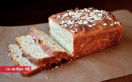 صبي العجين في قالب مدهون بقليل من الزيت ثم رشي كمية من رقائق الشوفان على سطح العجين
