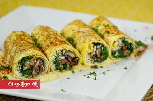 ضعي وسط كل كريب ملعقتين من الحشوة واطوي الكريب على شكل رول ثم ضعيه في صينية مدهونة بالقليل من الزيت وادخليها إلى الفرن حتى يذوب الجبن.