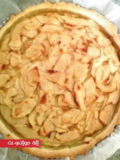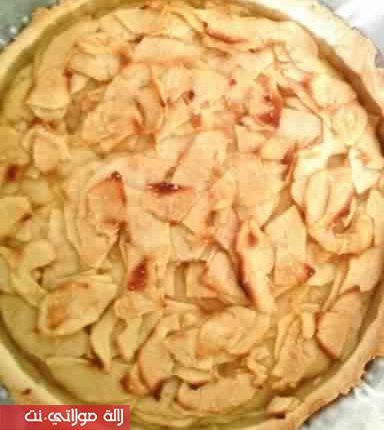 صب الكريمة على العجين ثم التفاح ويرش بقليل من الخبز والسكر تطبخ لمدة 30 دقيقة في درجة 190C.