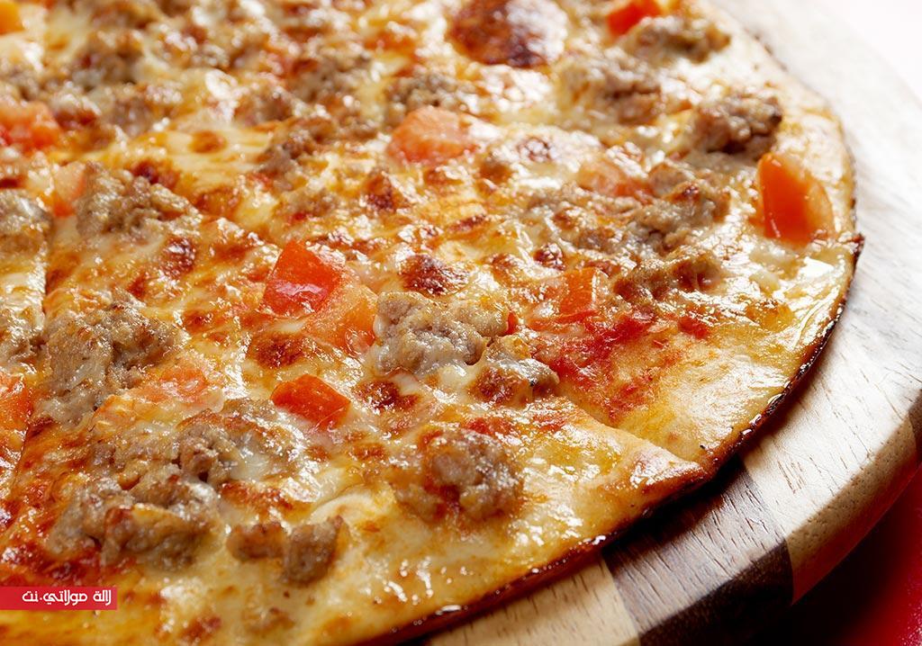 طرح العجين على ورقة الخبز و دهن العجين بالصلصة، وترتيب البصل والنقانق والطماطم والذرة. يرش الزعتر.