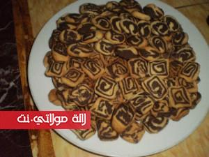 نمزج الزبدة مع السكر والفانيلا جيداً ثم نضيف الدقيق شيئاً فشيئاً حتى نحصل على عجين  متماسك يقسم إلى قسمين نضيف لأحدهما الكاكاو ثم تبسط الكرات بالدلاك، نضعهما على بعض ثم نبدأ باللف نشكله كما في الصورة ثم ندخل القضبان إلى المجمد لمدة نصف ساعة ثم تقطع مربعات وتدخل لفرن معتدل إلى أن تأخذ اللون من الجهتين.