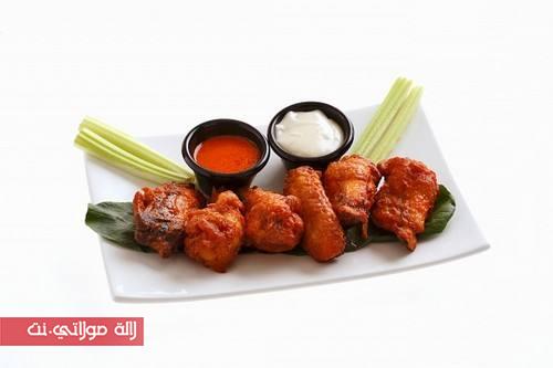نصف ليمونه، وقلبي جيداً. 2- ضعي المزيج السابق في طبق التقديم، وفوقهم أجنحة الدجاج المقلية، وزينيها بالليمون وأوراق الخس.