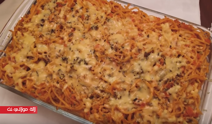 نأخد السباغيتي بعدما قمنا بصلقها ونمزجها مع الصلصة ونضع نصفها في اناء يدخل للفرن ونرش القليل من الجبن المبشور ثم نضيف ماتبقى من السباغيتي ونضع فوقه الجبن المبشور وندخلها للفرن حتى يذوب الجبن