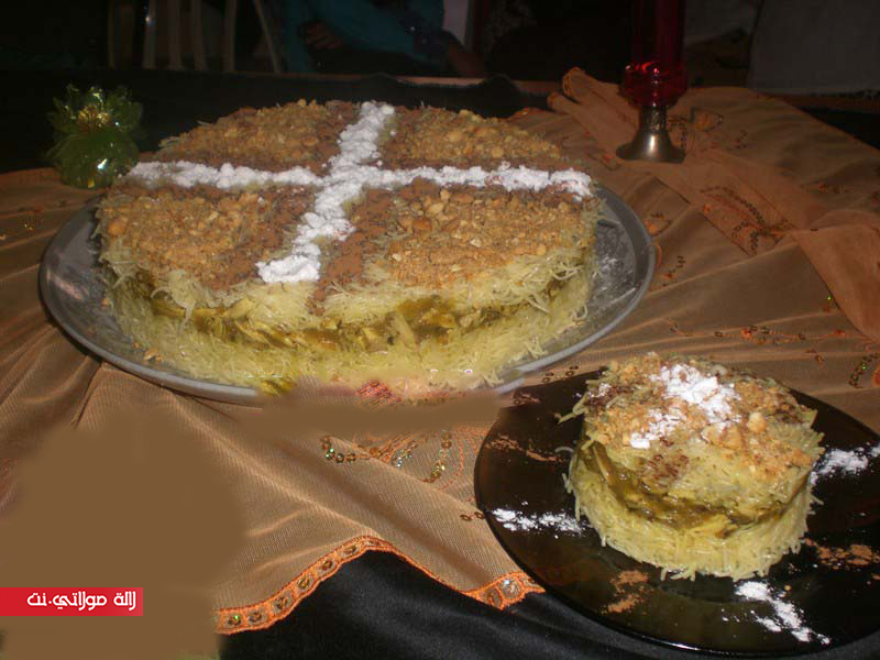 ناخذ صحن ونضع فيع مول بدون قاع ونضع طبقة من السفة ونبسطها جيدا ثم نضيف الدجاج وطبقة من اللوز ونضيف طبقة اخرى من السفة ونزين الوجه بالقرفة واللوز والسكر .
