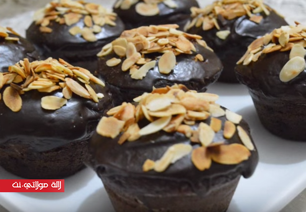 عندما نخرج الكوب كيك من الفرن نتركه يبرد نذيب القليل من الشوكولا في حمام مريم مع ملعقة زيت ونضيف للشوكولا ملعقتين ياغورت أي نكهة ونزين به الكوب كيك من الوجه ونرشهم بالقليل من رقائق اللوز