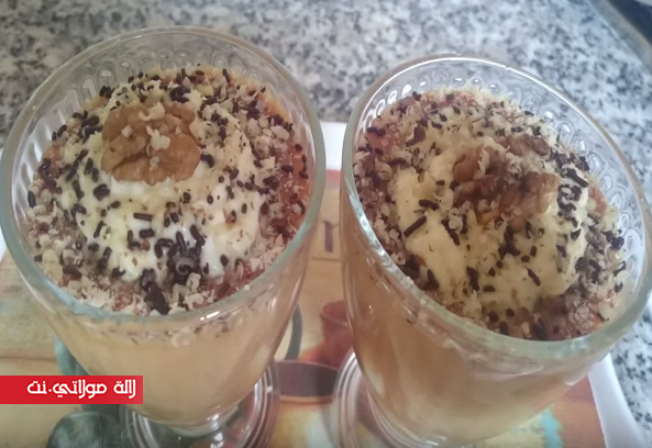 نضع الخليط في كؤوس التقديم وندخله للثلاجة حتى يبرد ونزينه حسب الرغبة