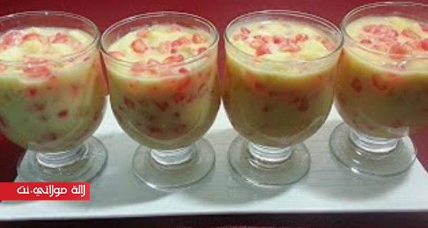 نقطعو البنان والتفاحة مكعبات و نضيفوه على الرمان و نزيدو عليه الياغورت و نحركو الخليط  ,و نكبوه في كيسان للتقديم.