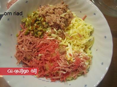 في إناء نخلط كل من المعكونة + بطاطس + البيض + الكاشير بكل أنواعه + الطون + الزيتون + الفرماج المبشور + معدنوس