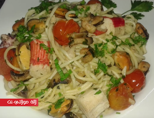 السباغيتي نصلقها في الماء والملح عندما تطهى نزيلها من فوق النار ونصفيها ونضيفها لفواكه البحر عندما تطهى ونترك الكل فوق النار تقريبا 5 دقائق على نار خفيفة ويقدم بالصحلة والراحة.