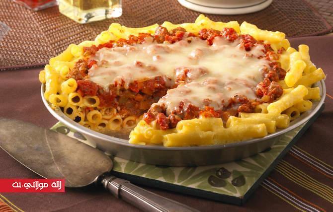 نضربو البيض والحليب مع شوية فلفل أسود في الخلاط الكهربائي نخلطو الكل مع المعكرونة، من بعد نديروها في صينية الفرن. نخلطو اللحم المفروم مع جميع الخضر لي سباقلنا طيبناها في المقلاة مع البصل ونديروها على المعكرونة. نرشها بالجبن وندخلها للفرن مدة نصف ساعة. يقدم طبق المعكرونة على شكل البيتزا بالصحة والعافية.