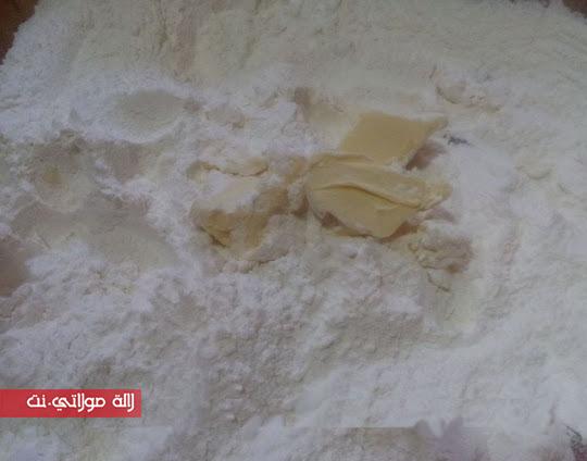 نخلطو الدقيق مع السكر، نضيفو ليهم الزبدة و نخلطوهم مزيان حتا تدخل الزبدة في الدقيق،