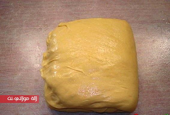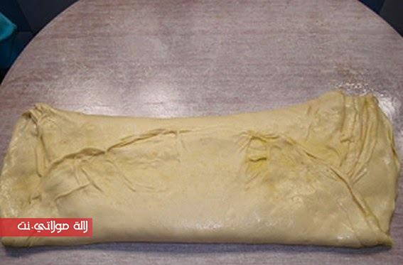 نطوي العجين المورق على شكل مربع نتركها ترتاح لمدة 15 دقيقة