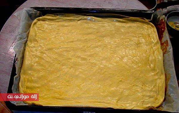 ندهن صينية الفرن بالزيت ونبسط العجين المورق جيدا على الصينية
