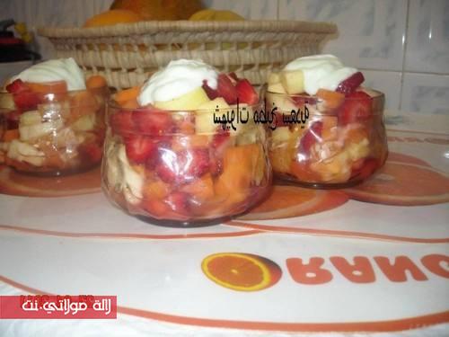 مقدير 3 بانات 6حبات فريز 1ثفاحة كبيرا 1ليمون كبيرا 1علبات ياغورت طريق يقطاع لكول مراباعات صغيرا جدا ويخلط لكول ثم نآخد كؤوس كبير ويسكب فيه لخاليط ثم نآخد ليغورت ونسكبه فوق لخليط بستعمل ملعق