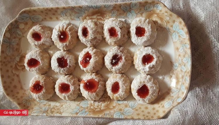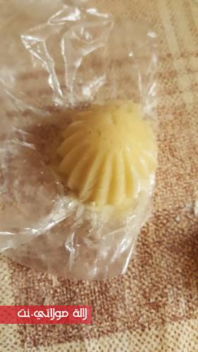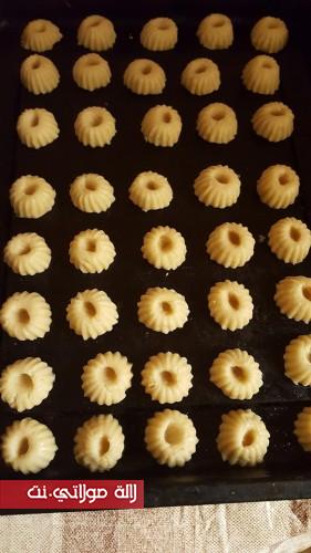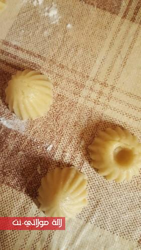 نخليوها ترتاح 5 دقايق ونشكلوها كيف بغينا ونديروها في سكر صقيل هنا استعملت مرشم ديال المعمول نديرو بلاستيكة فوق لمرشم عاد نعمروه بالعجينة ونضغطو عليها مزيان ونقلبوها في صينية مدهونة نديىو حفرة صغيرة لوسط وندخلوها طيب على درجة حرارة 180 حتى تحمر من لتحت عاد نحمروها من لفوق نخليوها ترتاح شوية غير تولي دافية ونمرمدوها في سكر صقيل مغربل من قبل ونزينوها بالكونفتير فريز او حب لملوك المهم احمر او شكلاط اختياري