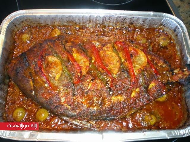 والشرمولة اللي بقات لينا نضيفوها للطماطم المحكوكة ,وفي طاوة للفرن نصب الصلصة مع الإحتفاظ بالقليل وانحطو فوقها السمكة ثم نزينوها بالفلفل والحامض والزيتون وانصبو فوقهم الصلصة اللي احتافظنا بيها, وفي الأخير انغطيوها بالألمنيوم واندخلوها الفرن ومنين طيب نعريو عليها باش تحمر.