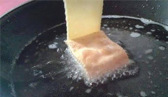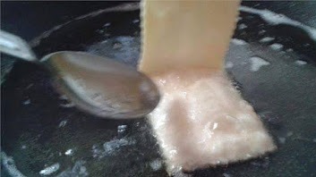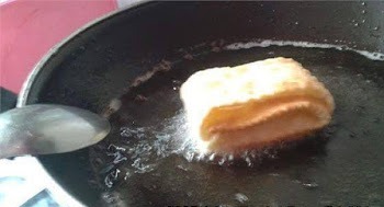 ناخد كل شريط و نبدا في القلي في مقلاة بها قليل من الزيت ونستعين بملعقة كي نرش العجين بالزيت الساخن كما هو مبين في الصور