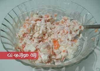 نقطع 6 سرطان البحر العصي قطع صغيرة ونخلط مع شوية مايونيز ونخليوه حتى نوجدو بطاطا