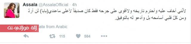 وغرّدت أصالة عبر حسابها على موقع “تويتر”: “لأنّني أخاف عليه وأحترم تاريخه ولاأقوى على جرحه فقد كان صديقاً لأغلى ماعندي (بابا) لن أردّ ومن كلّ قلبي أسامحه بل وأدعو له بالتوفيق”.