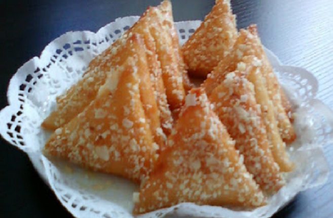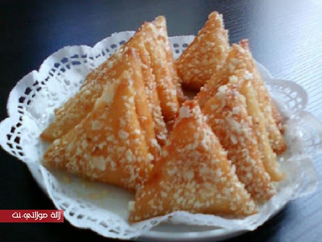 توضع كويرة اللوز على حافة المستطيل، تسطح قليلا ثم تطوى على نفسها على شكل مثلث.