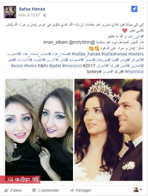 كشفت الفنانتان التوأم هناء وصفاء على حسابهما الخاص بالفايسبوك، عن حضورهن لزفاف المغربية إيمان الباني وزوجها التركي مراد يلدريم نهاية الأسبوع الجاري.