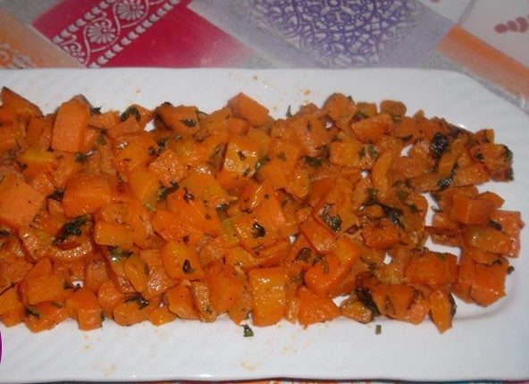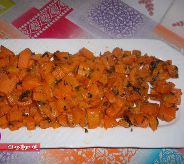 ناخد مقلاة ندير فيها زيت+ثوم محكوك+ملح+تحميرة+كمون+معدنوس مقطع رقيق ونقلي كلشي شوية ثم نضيف خيزو ونخلط مزين حتى يتقلى ونقدمو مع الحامض مصير