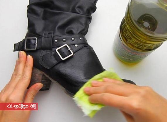 الخدوش: ببساطة، بلل قطة من القماش بزيت الزيتون وامسح الحذاء لتخفي الخدوش، من ثم نظف الزيت بقطعة قماش مبللة بالمياه.