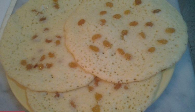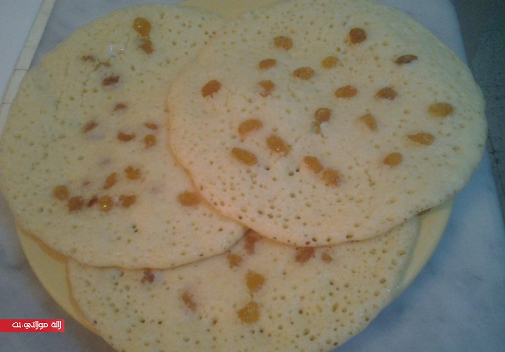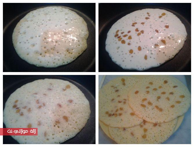 ثم نضع فوق البغرير حبات الزبيب, ونترك البغرير  حتى ينضج, ثم ننزع البغرير ونضعه في صحن, وندهنه حسب الرغبة