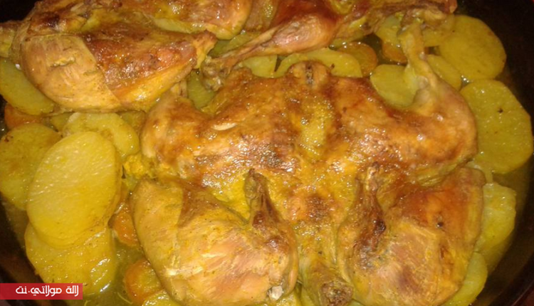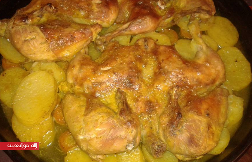 الدجاج مغسول ومنشف الدجاجة قسمتها من جهة الصدر ورقتو فدانون مسوس عصير الحامض توم محكوك سكنجبير طري محكوك زيت العود اوراق موسى خرقوم بلدي سودانية احتيارية وصوص صوجة وترقديه بليلة قبل وبطاطا وخيزو قطعتهوم دواور ودرت ليهوم من نفس تخليطة الدجاج وستفتهوم فلاطة ودرت الدجاجات فوقهوم مع شوية ماء وغطيت بورق الطهي تم الالمنيوم وخليتو فالفران مشعول من فوق والتحت حتى طاب وعريتو باش تحمر من الفوق كيجي روعة بالصحة والعافية